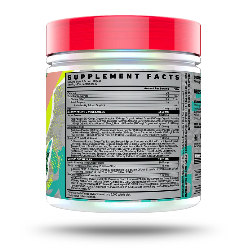 It's easier than ever to get your fruits and veggies in! GHOST® GREENS combines 19 individually sourced Greens and Reds with a full 100mg dose of Spectra™, Prebiotics, 10 billion CFUs Probiotic and the super-premium BioCore® Optimum Complete Digestive Enzymes!
